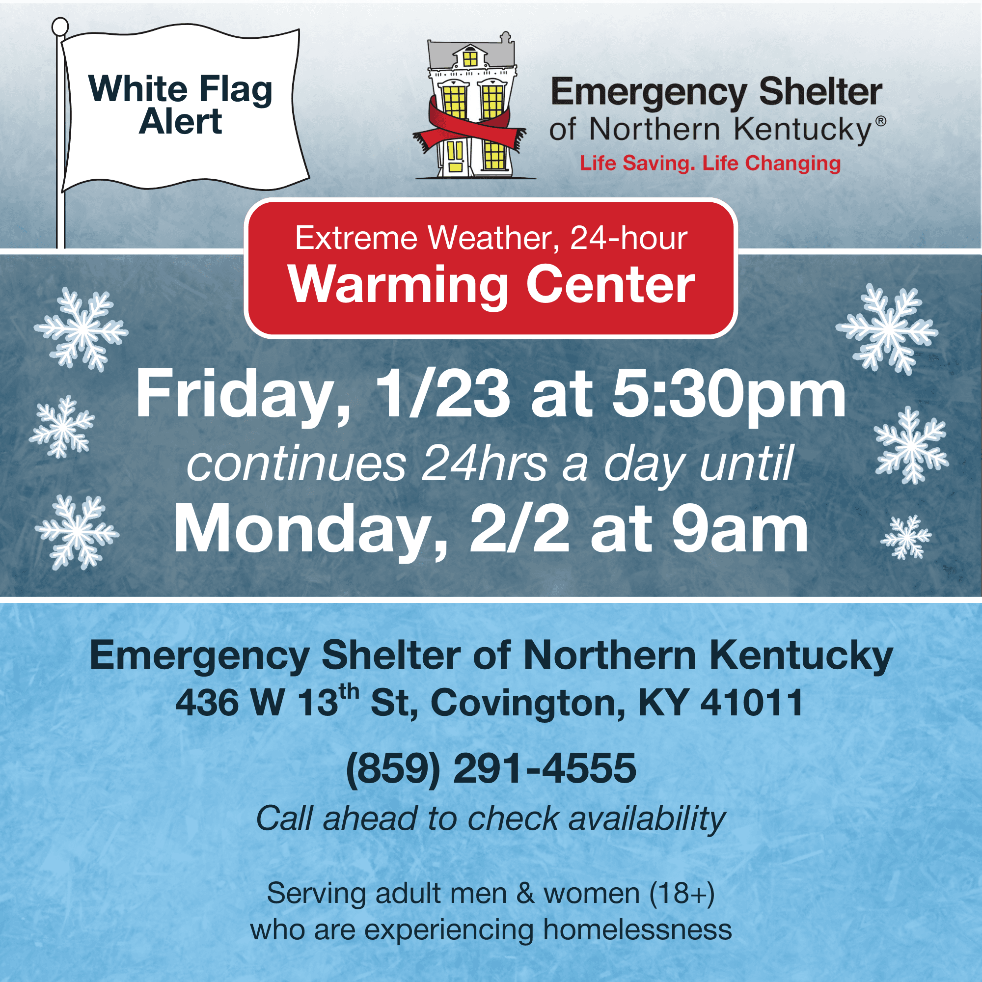 The Emergency Shelter of Northern Kentucky is activating a 24-hour Warming Center under White Flag procedures, in partnership with Kenton County and the City of Covington, to make sure our neighbors have a safe, warm place during this storm.